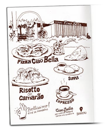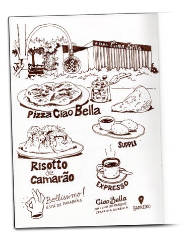 Na minha primeira visita ao restaurante Ciao Bella, no Barreiro, tinha comigo um caderno e um caneta de cor sanguínea. O desenho foi terminado já com o café frio.