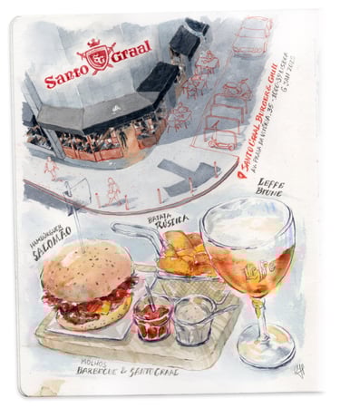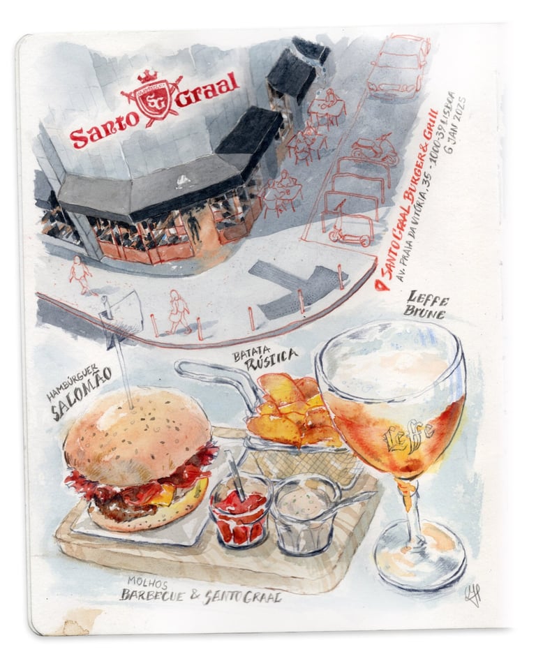 Durante um almoço na hamburgeria Santo Graal, em Lisboa, registei as linhas principais da refeição, tomei algumas notas, e já no estúdio criei a composição a lápis e aguarela com a ajuda do Google Maps.