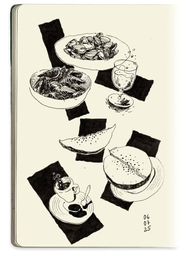 Num dos habituais almoços de família, retirei o caderno e uma caneta preta e registei, desta forma, os pratos de ameijoas, mexilhão, melancia e um copo de vinho branco, finalizando com um café.