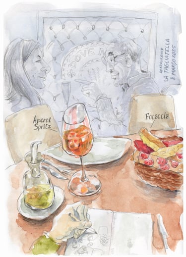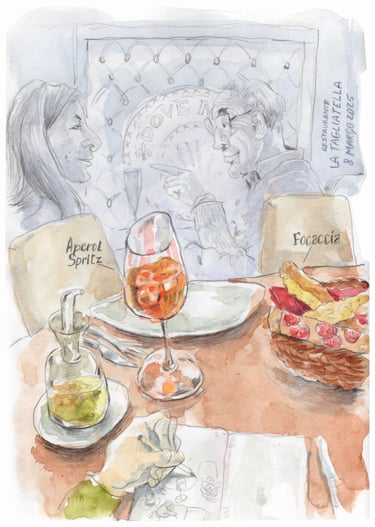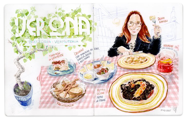 Numa visita ao restaurante Verona, na cidade onde vivo, desenhei a base com lápis e terminei com aguarela já no estúdio. A ideia era criar uma composição que fizesse justiça às texturas e sabores e ao ambiente do restaurante.