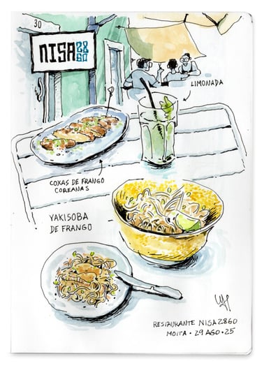 Depois de uma pequena volta de bicicleta, parei na Moita para almoçar no Nisa 2860. Como tenho sempre um caderno e algum material de desenho, alternei a refeição com algumas linhas e pinceladas de aguarela.